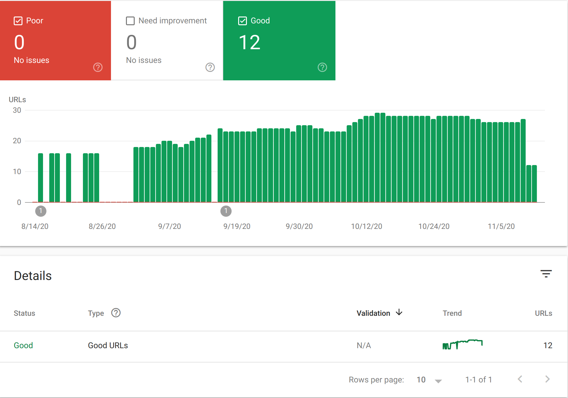 In the search console, under the Enhancement menu section, you will find Core Web Vitals. Google marks your pages as either Good, Needs Improvement, or Poor.