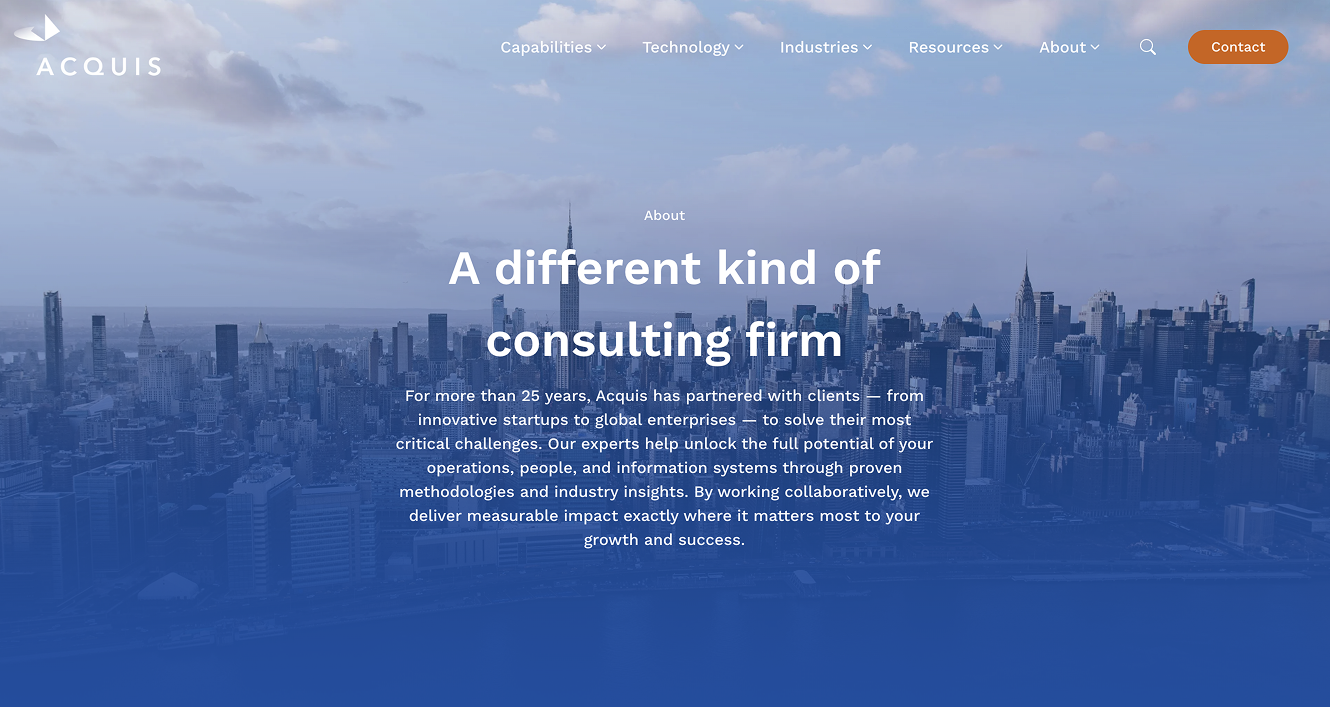 Acquis faced a challenge common to many successful consulting firms: how to clearly translate their breadth and depth of expertise digitally. Their previous website didn’t fully capture the breadth of their capabilities or the depth of their industry knowledge and also lacked a strong expression of their people-first culture—a key differentiator in their field.