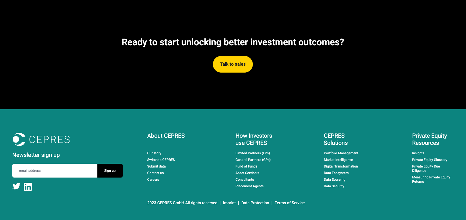 CEPRES provides industry-leading investment technology and the world's largest private market data network to help investors. They had a difficult to manage Wordpress instance that was suffering from plugin hell, was difficult to update and was becoming a security liability. They wanted a best-in-class website to power their SEO, performance marketing and lead funnels. They were convinced Storyblok would be the right tool and reached out to us in 2022 as they were looking for vetted Storyblok partners to help.