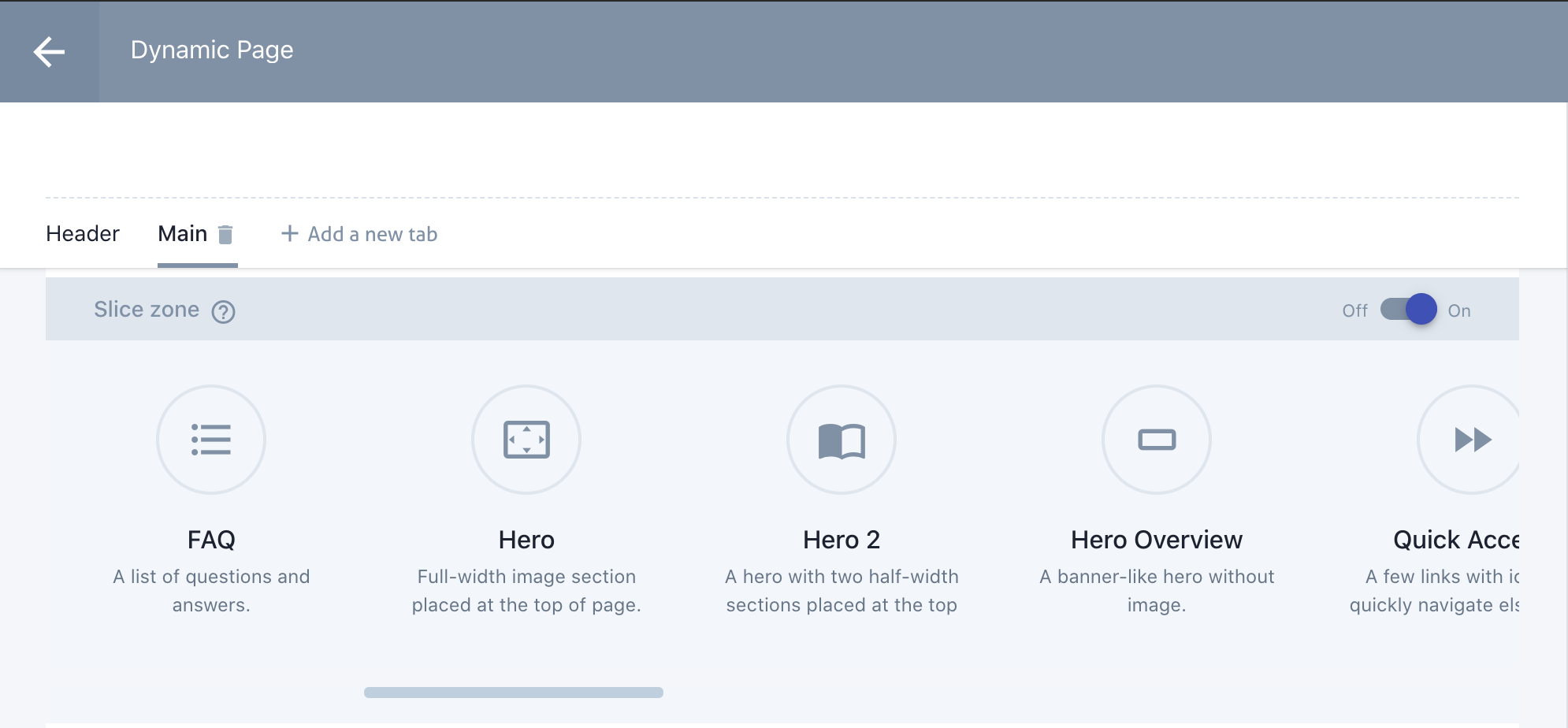 To enable content managers to create arbitrary pages in Prismic we created a repeatable custom document type, called Dynamic Page, within which we enabled the slice zone. For organizational purposes it had a header tab for title, url path and page metadata, and a main tab for the sectional content in the slice zone. You’ll see there’s a selection of various slices defined. Each of these would correspond to a section which will be implemented as React components.