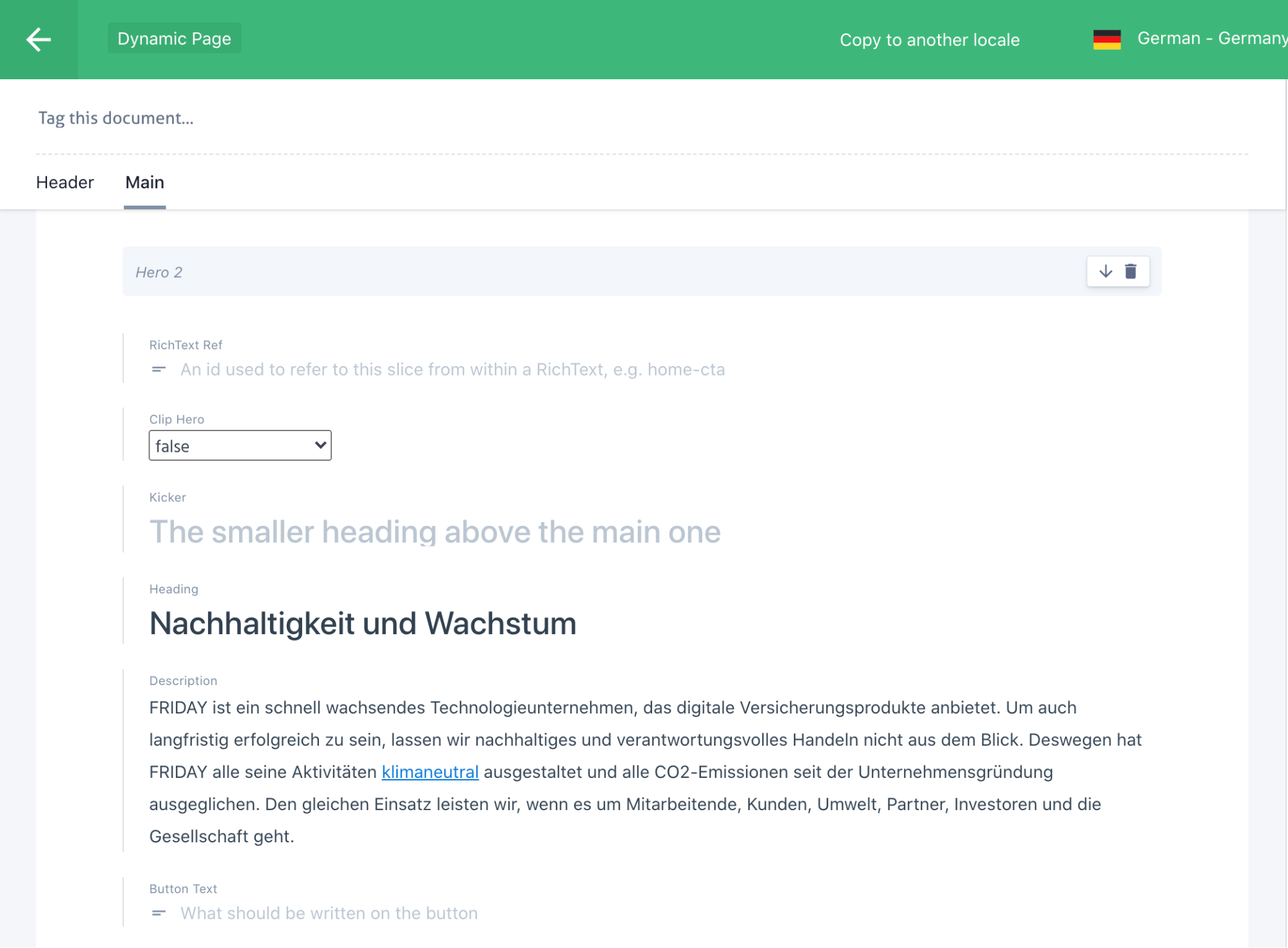 Below is an example document of the Dynamic Page type, and the initial Hero 2 slice used in that page.