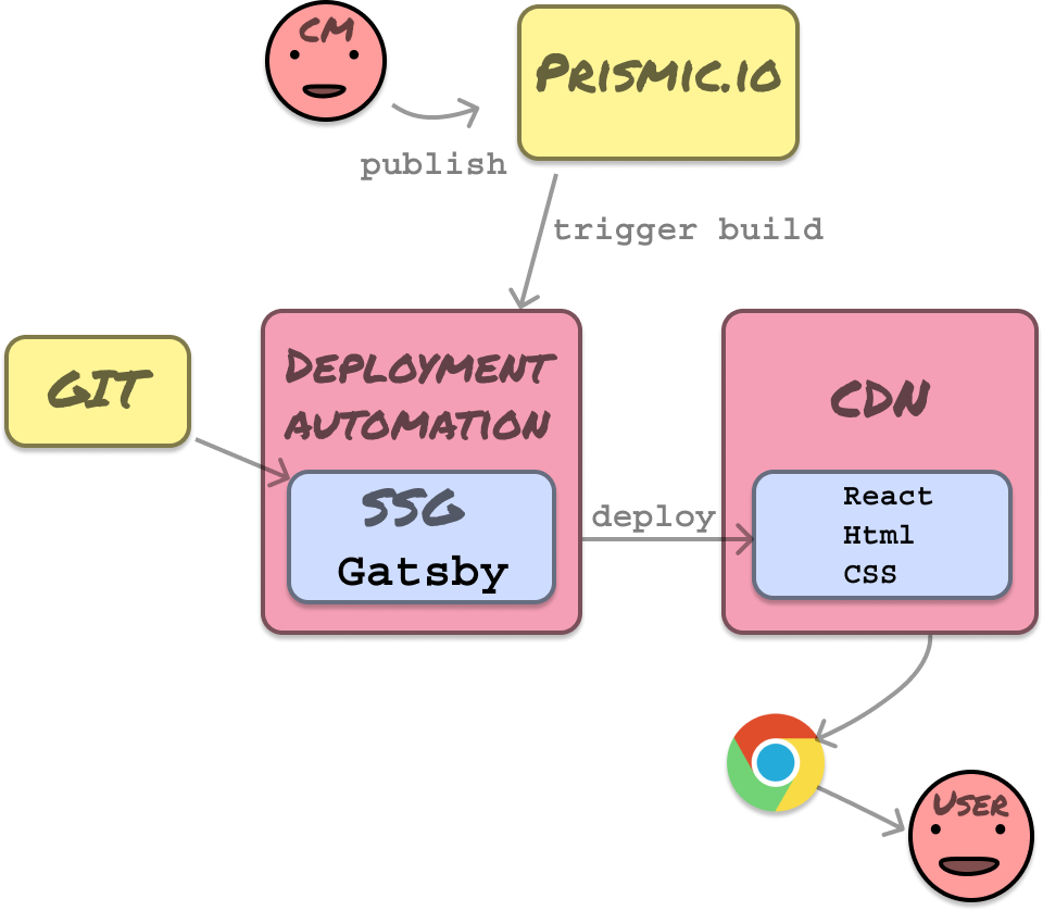 GatsbyJS is a static site generator, which means it’ll create the website as static html files. There’s a lot more to it but it’s all you need to know for now. The basic deploy process when publishing in Prismic would look like in the diagram below.