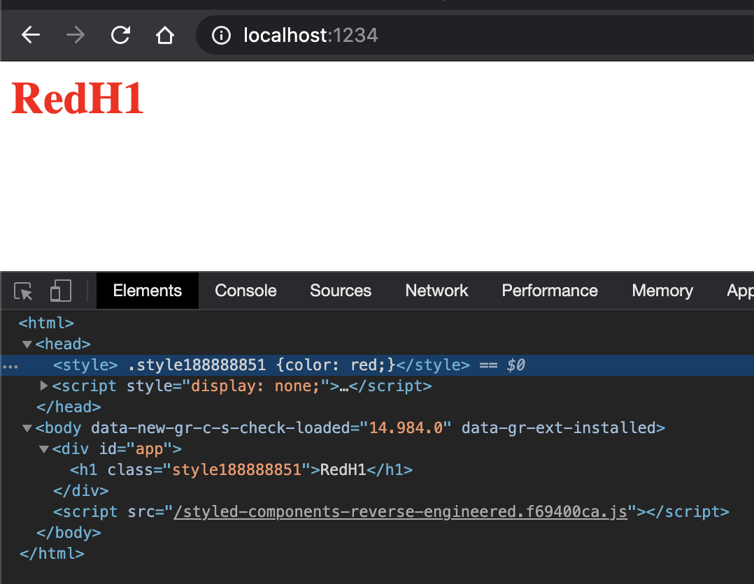 I must now take care of the styles and apply them to the h1 element. If you have ever noticed the generated HTML/CSS when using the original styled-components, it generates classNames and outputs all css styles in an internal stylesheet. Trying to recreate that, I am gonna focus of the following features: