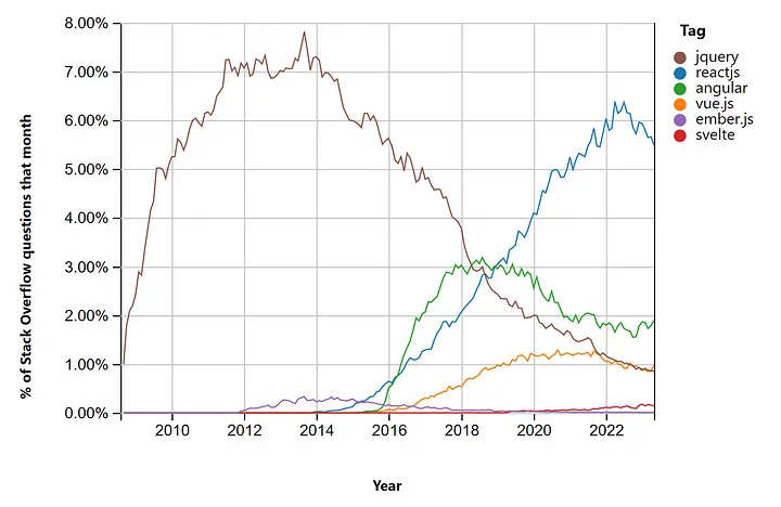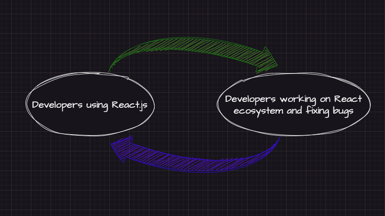 Positive feedback loop after passing the inflection point: React.js is currently experiencing widespread adoption, driven by a large user base that encourages continuous development within its ecosystem. This active community not only contributes to fixing bugs but also enhances the framework, which in turn attracts even more users.